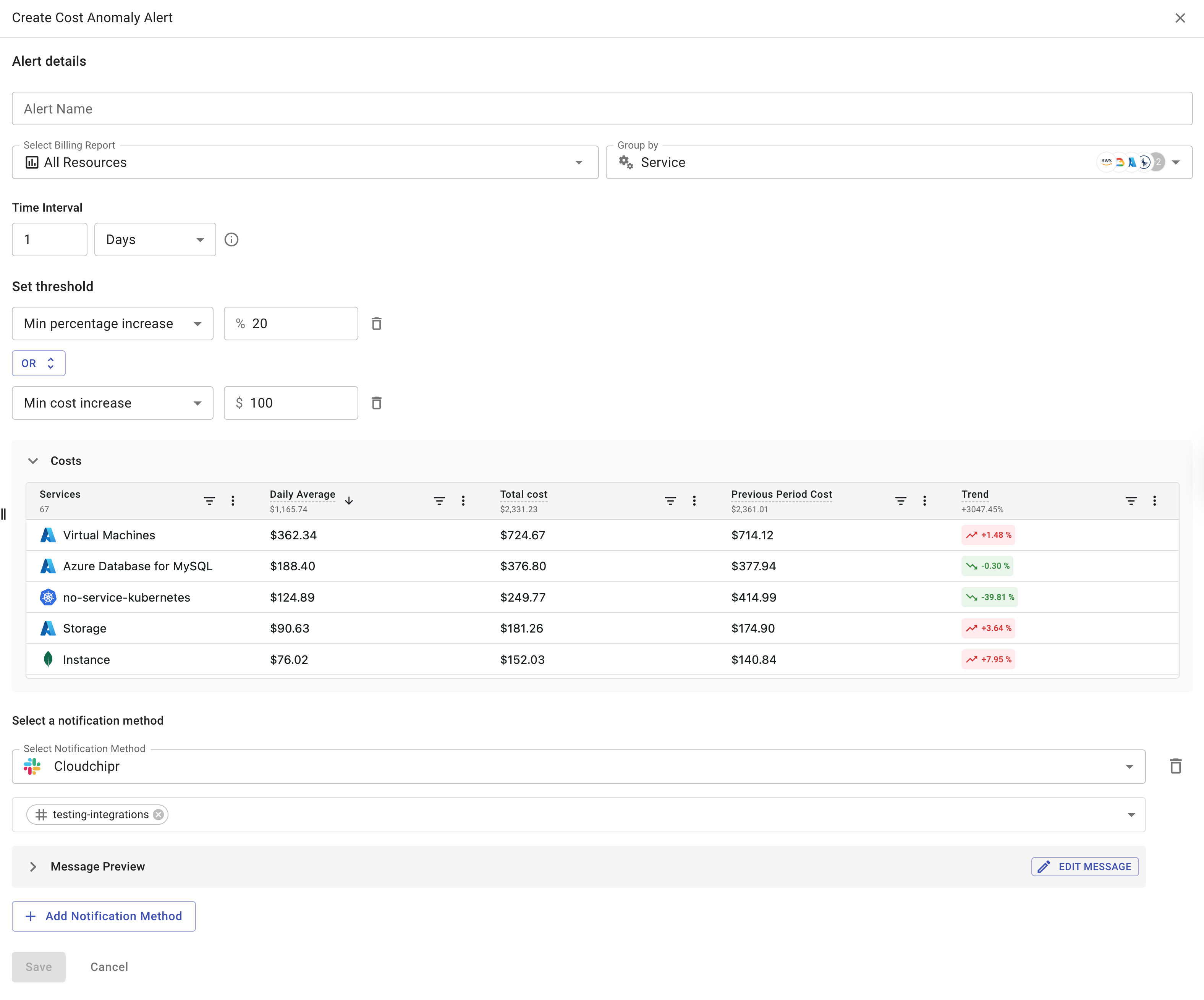 - Threshold: Set a threshold in either percentage or cost. You can also combine thresholds, for example, 10% or $100. A notification will be sent if the cost increases by more than 10% compared to the previous period, or/and if the cost exceeds $100.