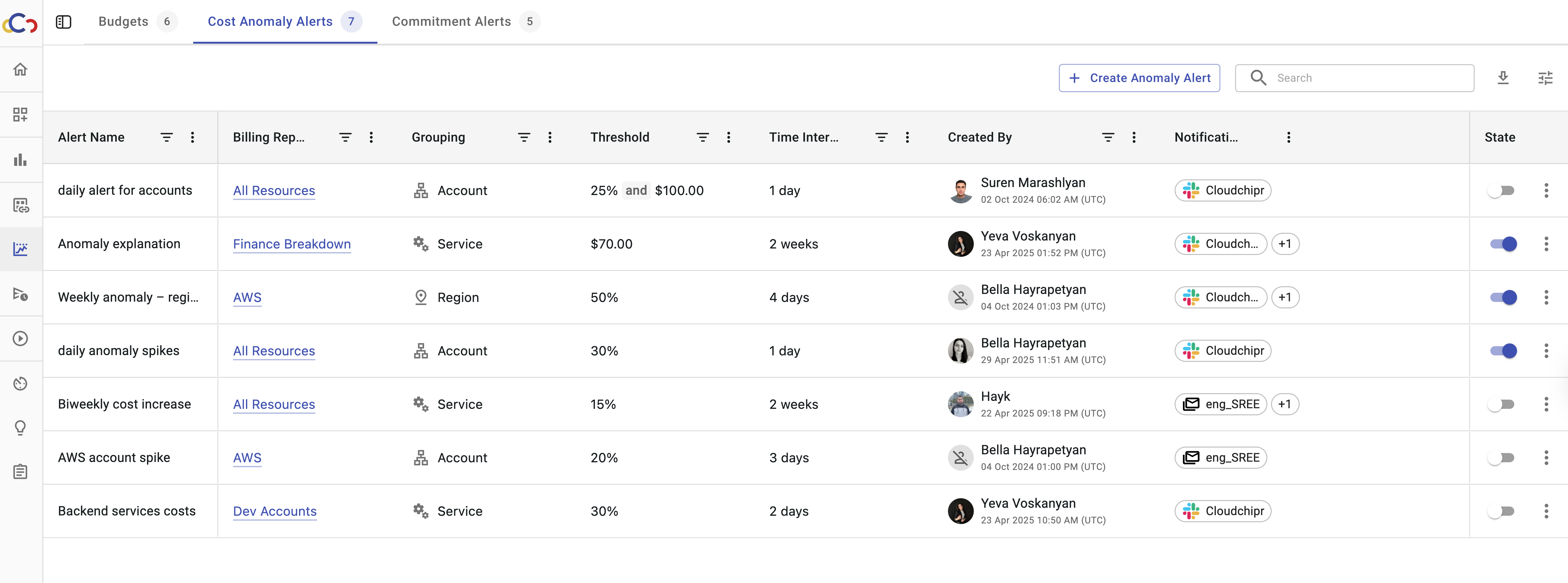 On the Cost Anomaly Alerts page, all created alerts are listed with their main attributes, such as the associated billing report, grouping criteria, and configured thresholds.