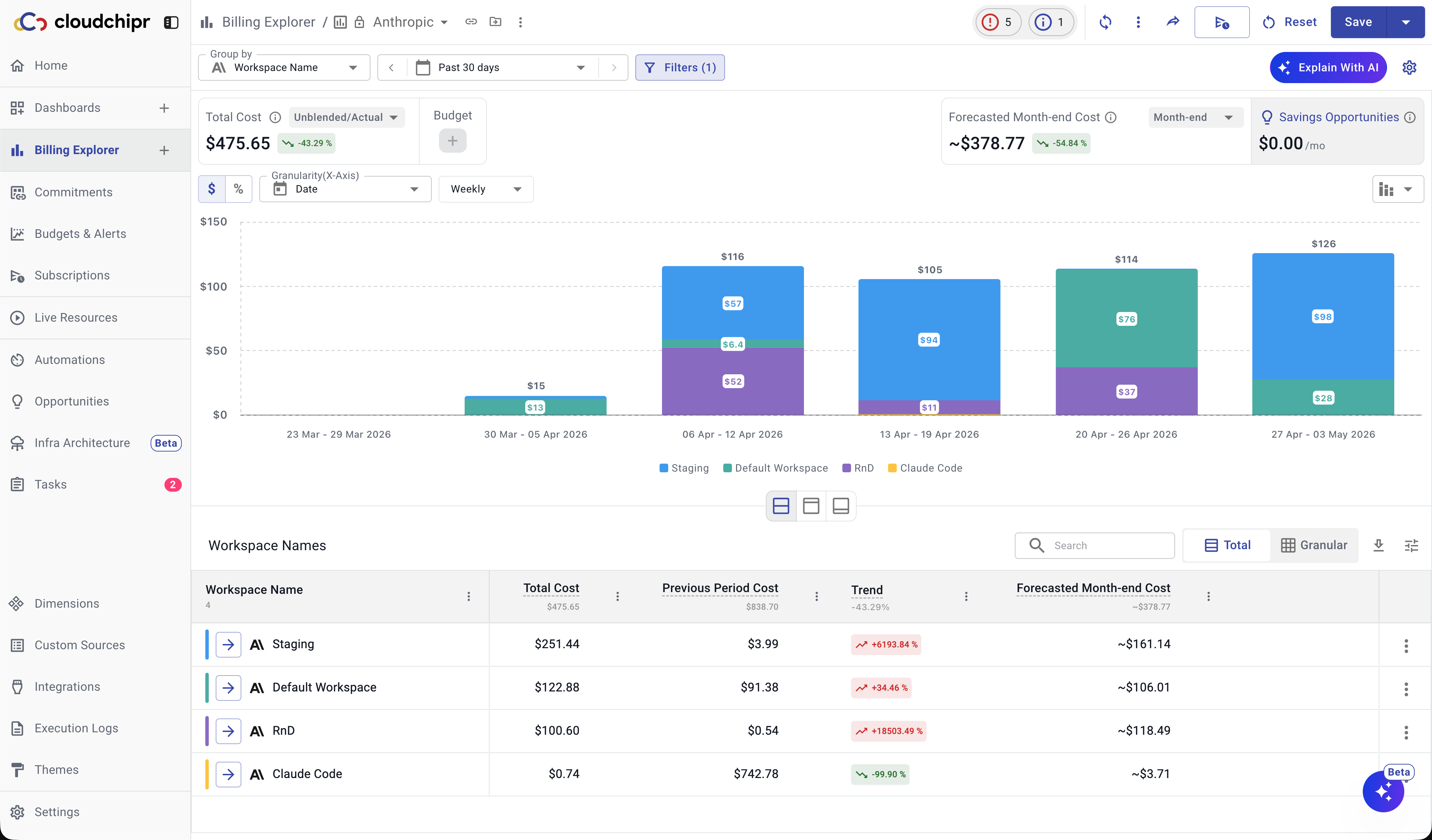 You can connect your Anthropic Organization to Cloudchipr to track and analyze your costs in Billing Explorer. Once connected, you can group and view costs by dimensions such as: