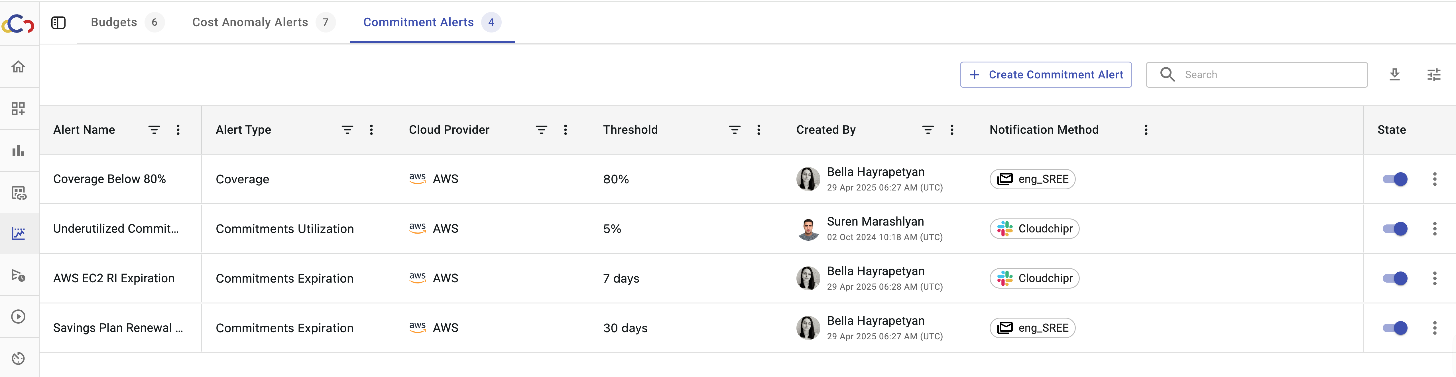 After creating an alert, it appears in the table on the Commitment Alerts page. The page lists all existing alerts along with their key attributes, including alert type, cloud provider, status, and configured thresholds.