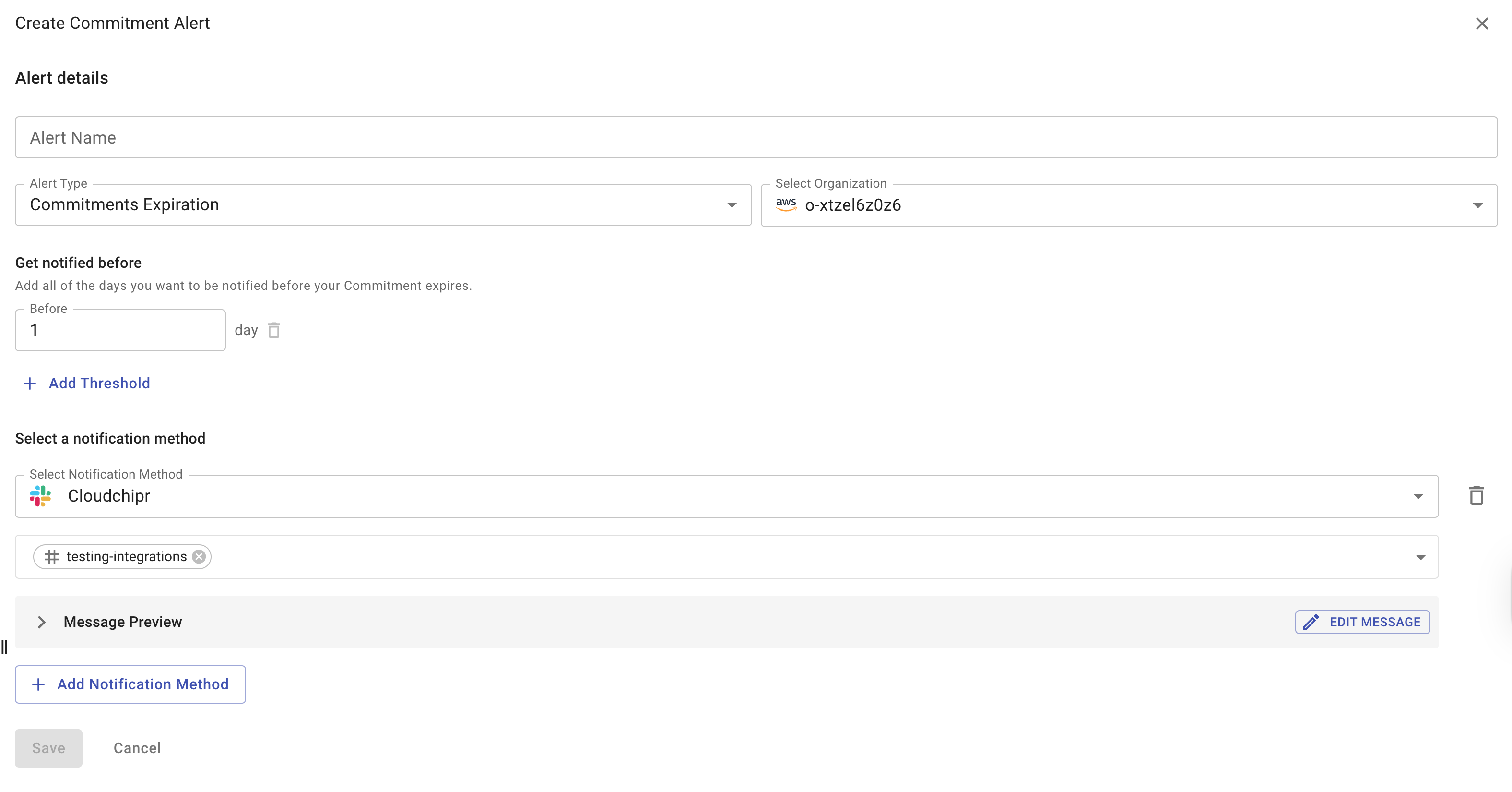 - Commitments Expiration – Sends notifications before a commitment expires, helping ensure renewals are handled on time. Select the organization with the commitment and specify how many days in advance you want to be notified. Multiple thresholds can be set (e.g., 30 days and 15 days before expiration).