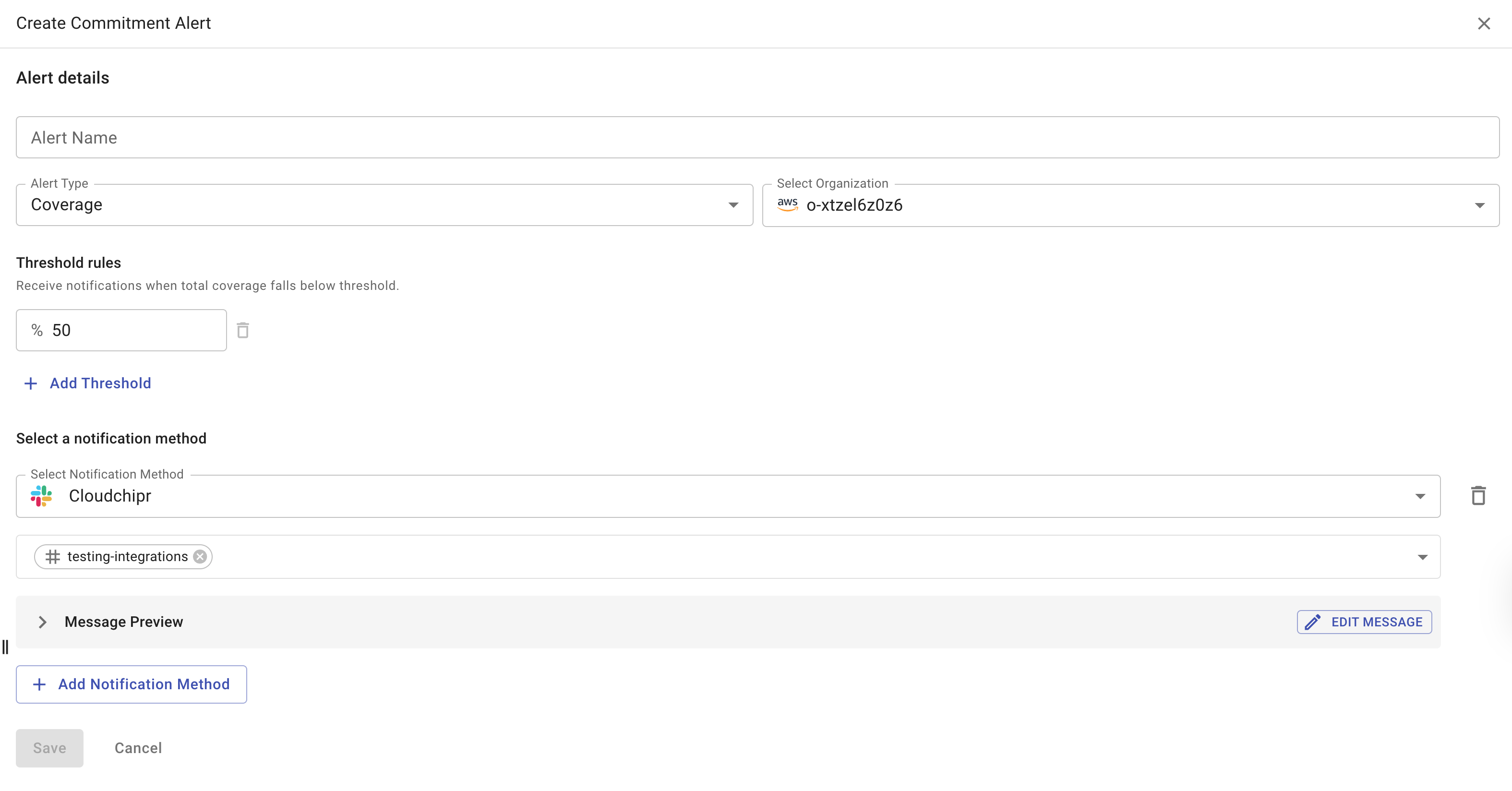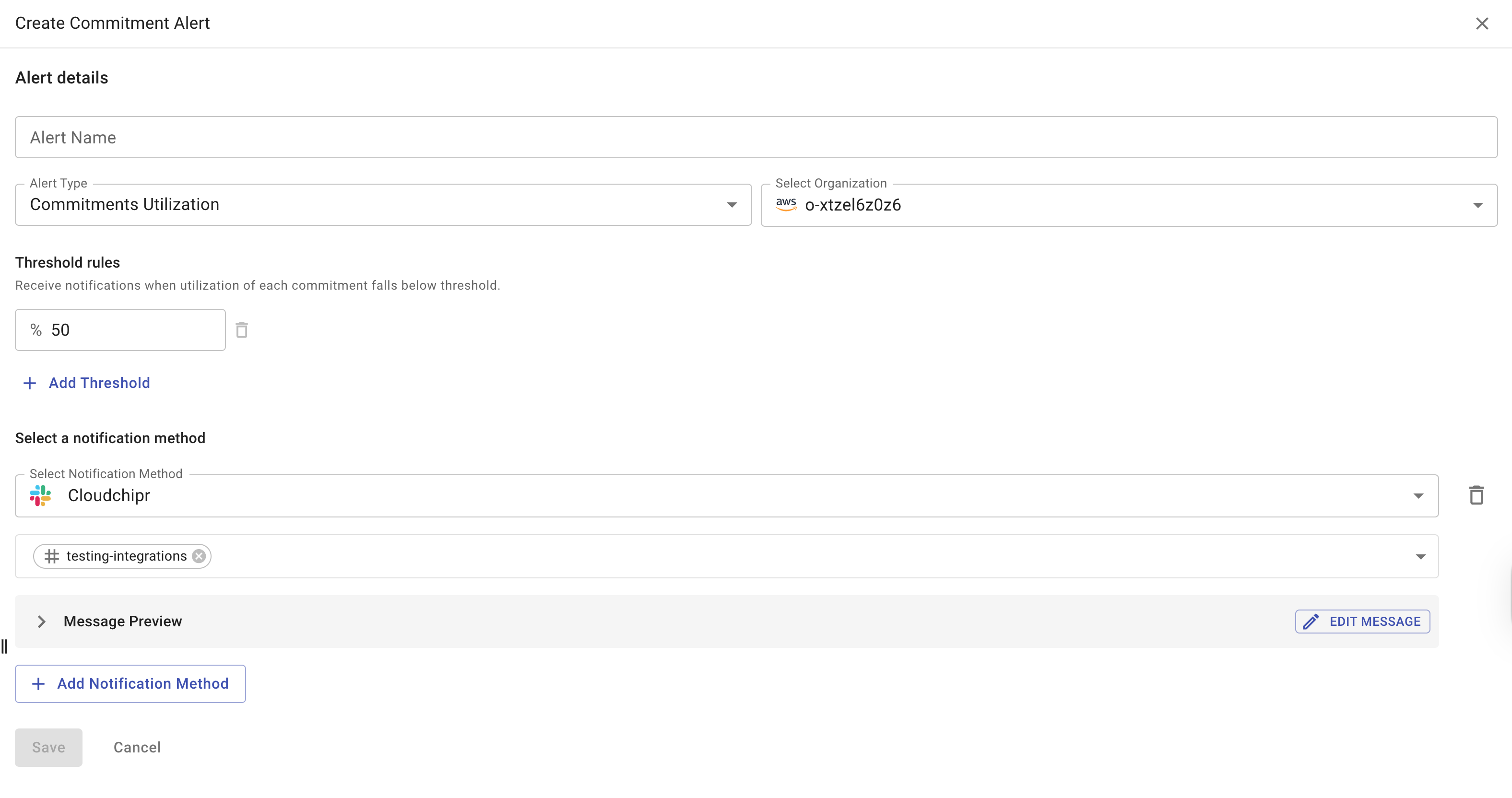- Commitments Utilization – Monitors prepaid commitments to detect underutilization or waste. Set a utilization threshold; alerts are triggered if usage falls below the defined value.