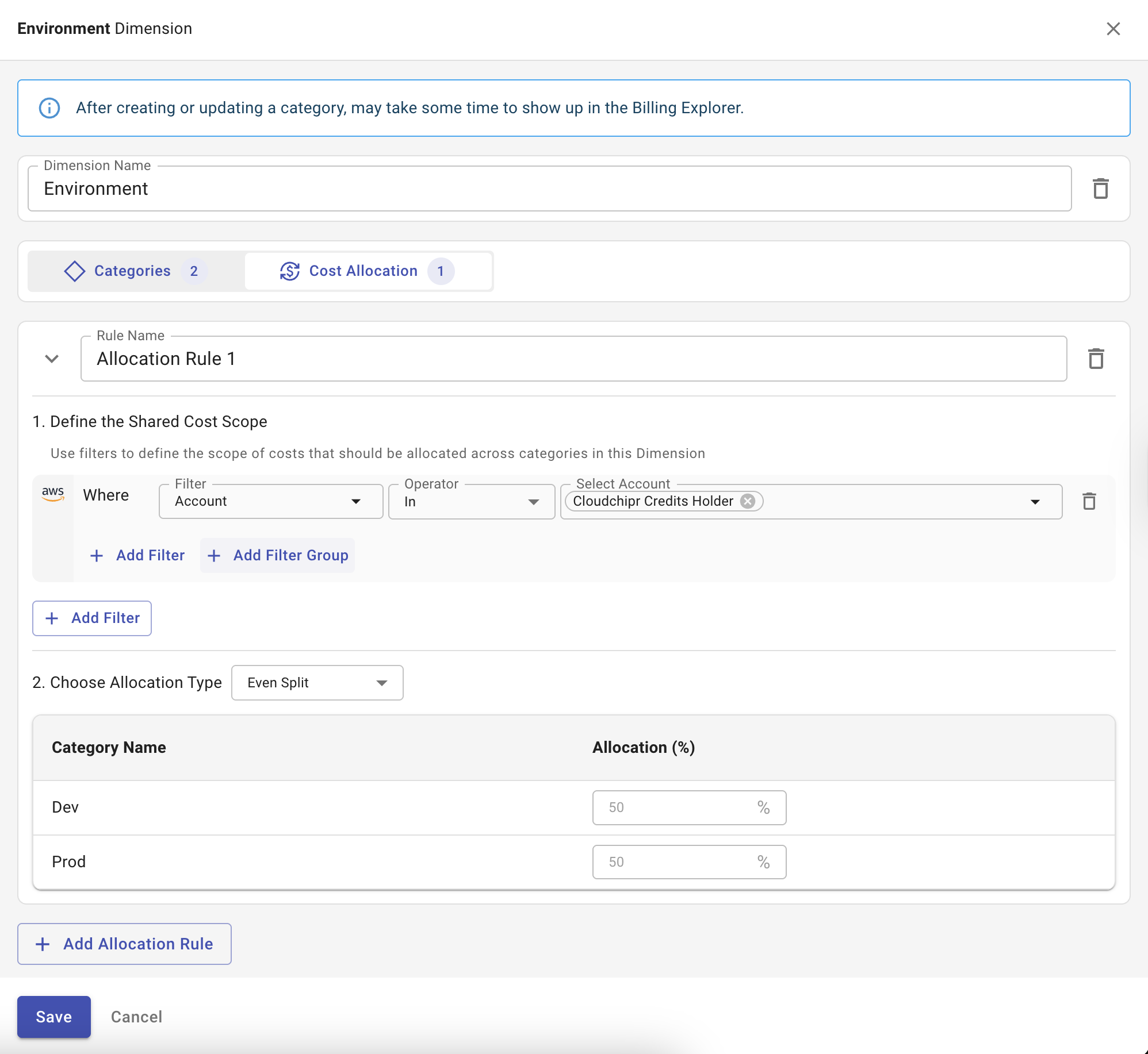 After creating or updating a category in Dimensions, changes may take some time to appear in Billing Explorer. This delay is due to the processing and synchronization of billing data. Once complete, updated categories are reflected in all reports and dashboards.
