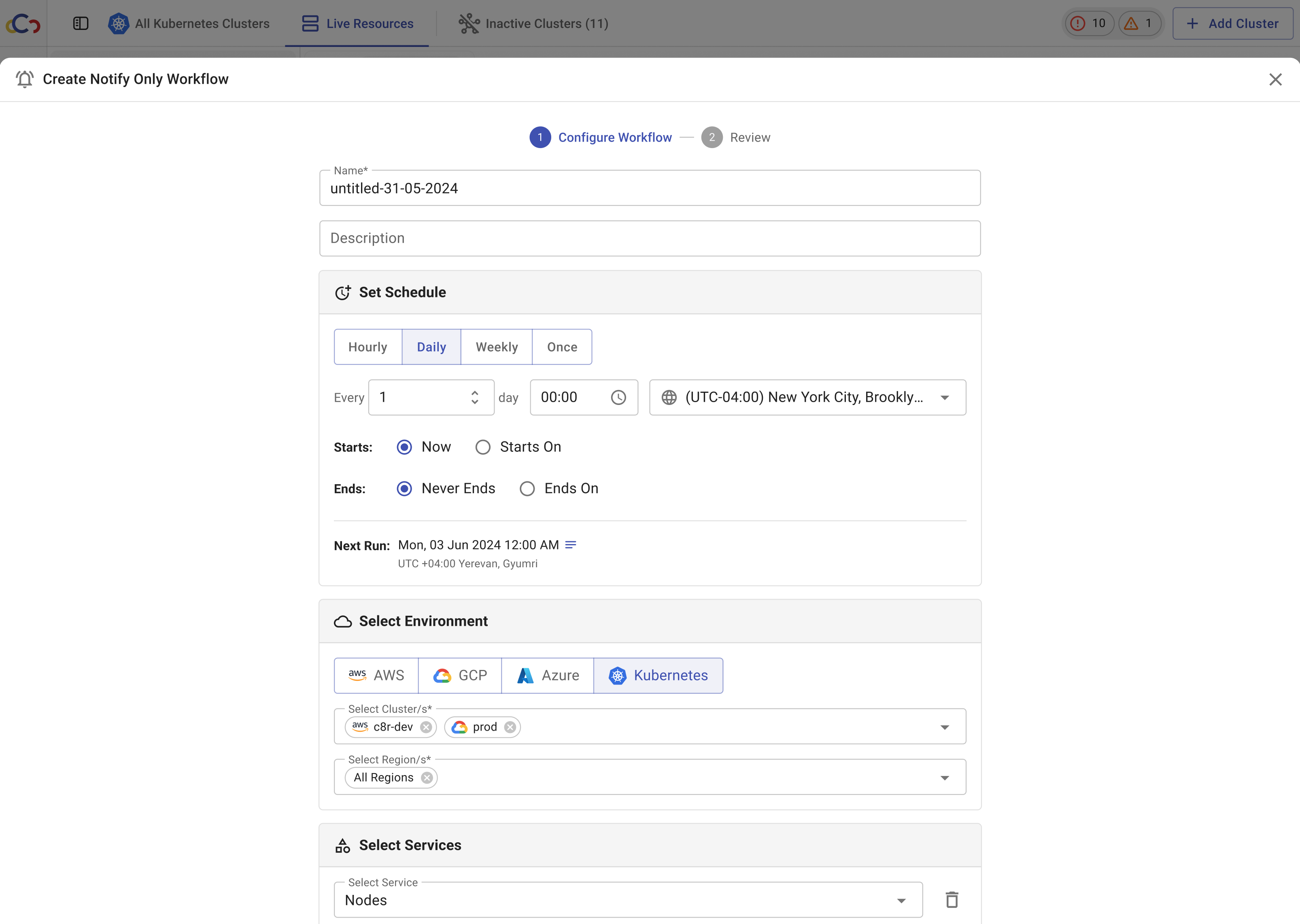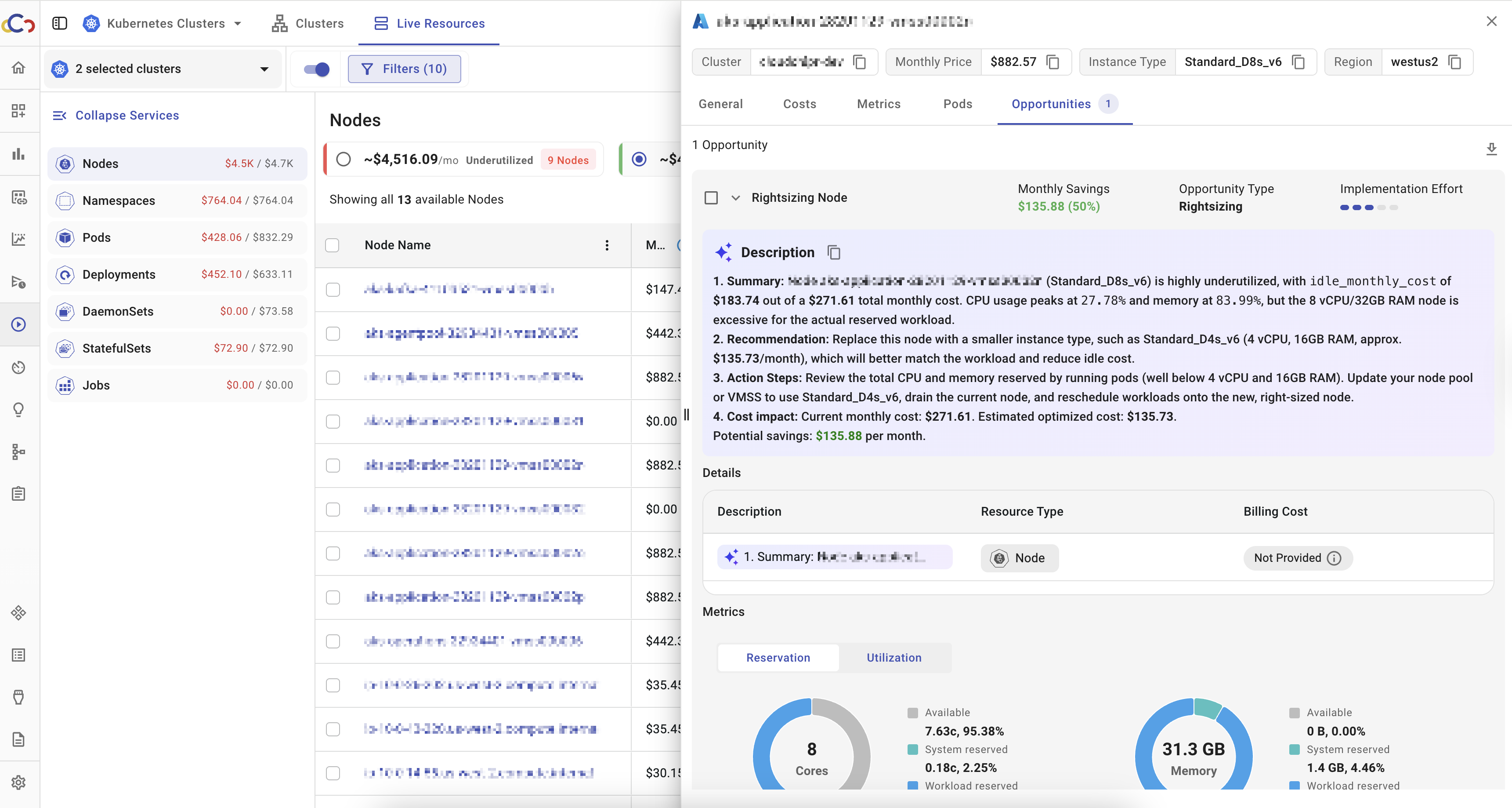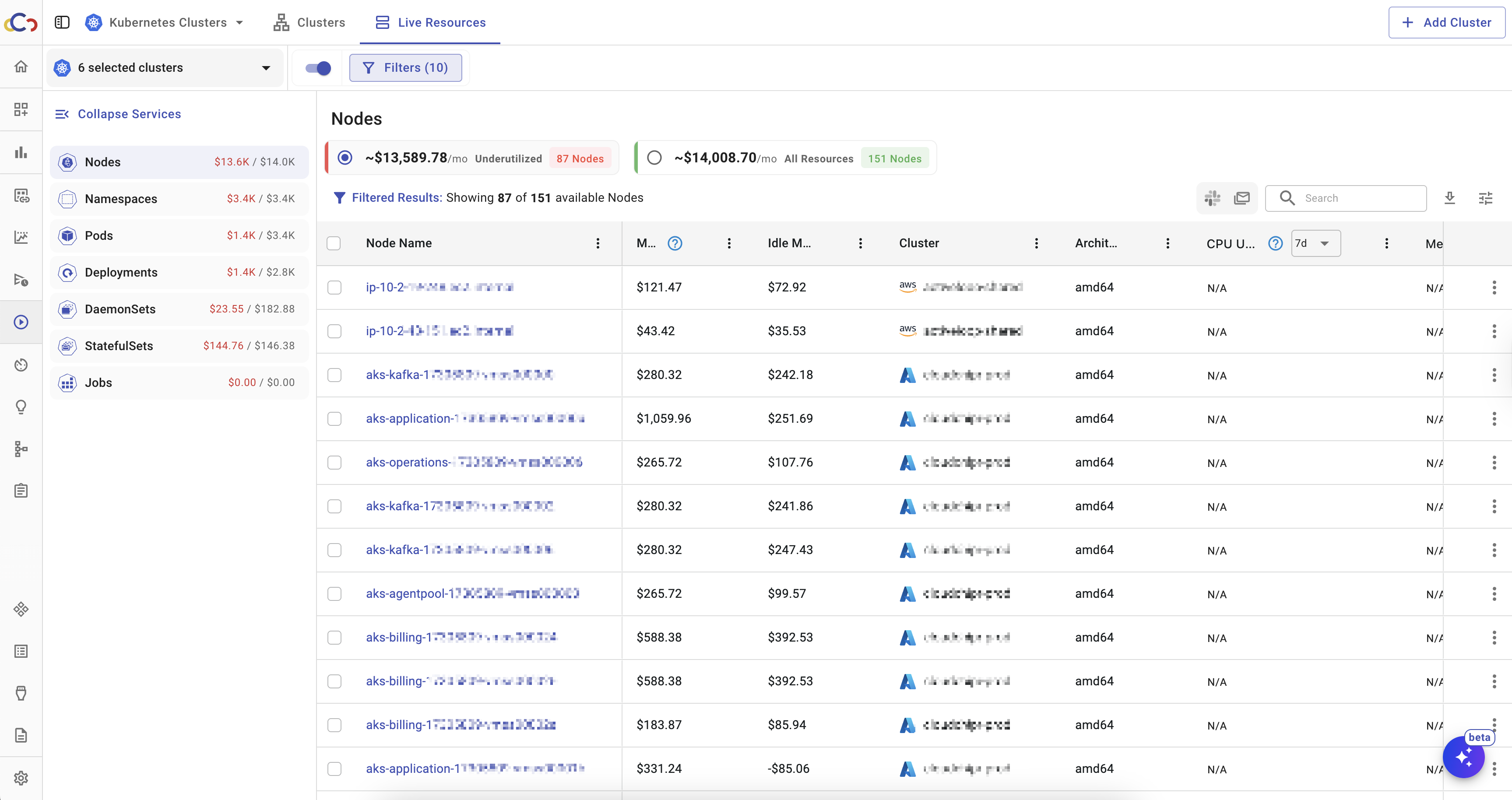 - View Live Resources – Access details for Clusters, Nodes, Namespaces, Pods, Deployments, DaemonSets, StatefulSets, and Jobs. Review metrics for each resource and identify underutilized workloads.