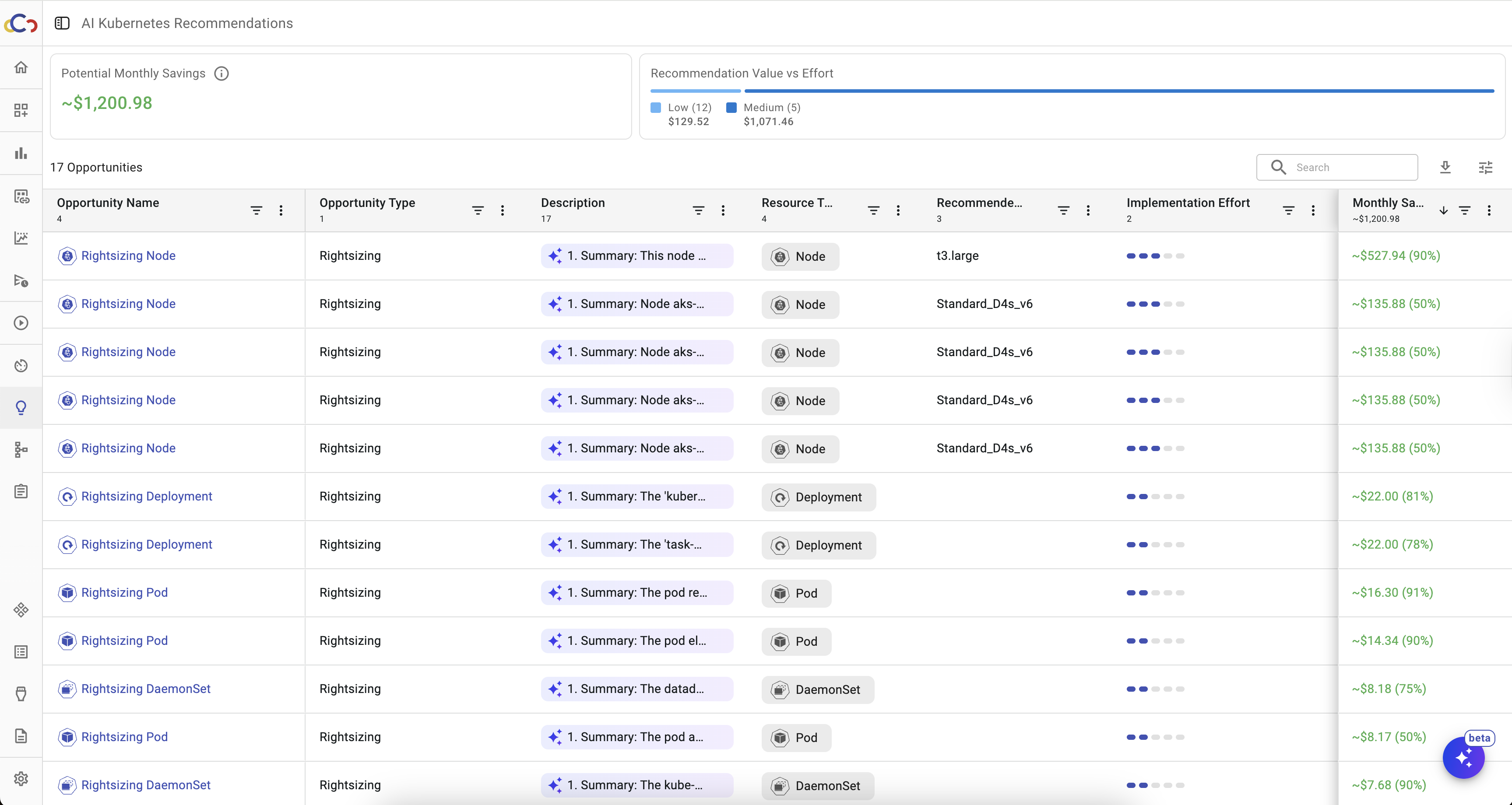 The Opportunities page provides Kubernetes optimization recommendations based on resource usage, including CPU, memory utilization, and requests. Recommendations are available for the following resource types: