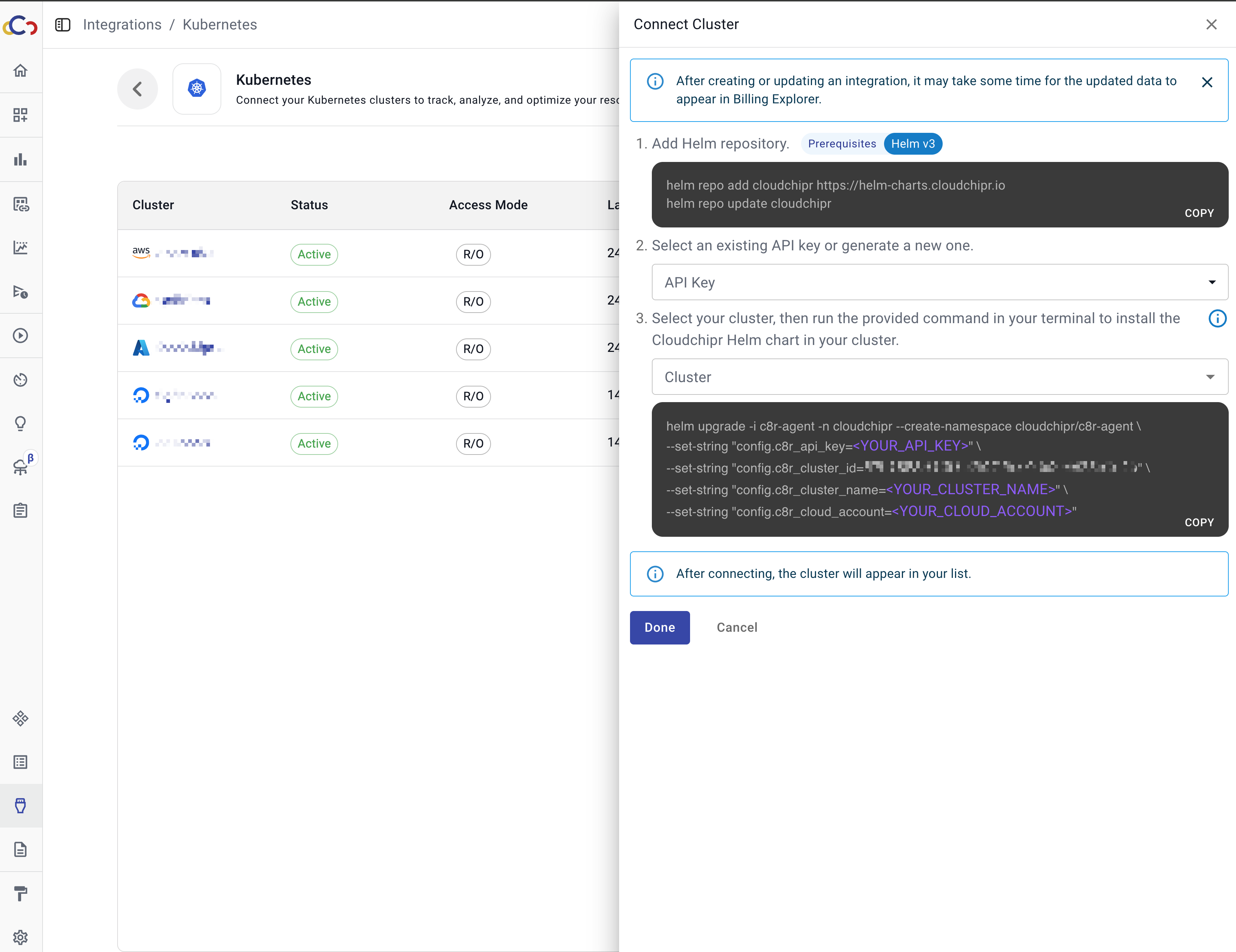 Copy and run the command provided in the drawer to add the Cloudchipr Helm repository. - Select an API key