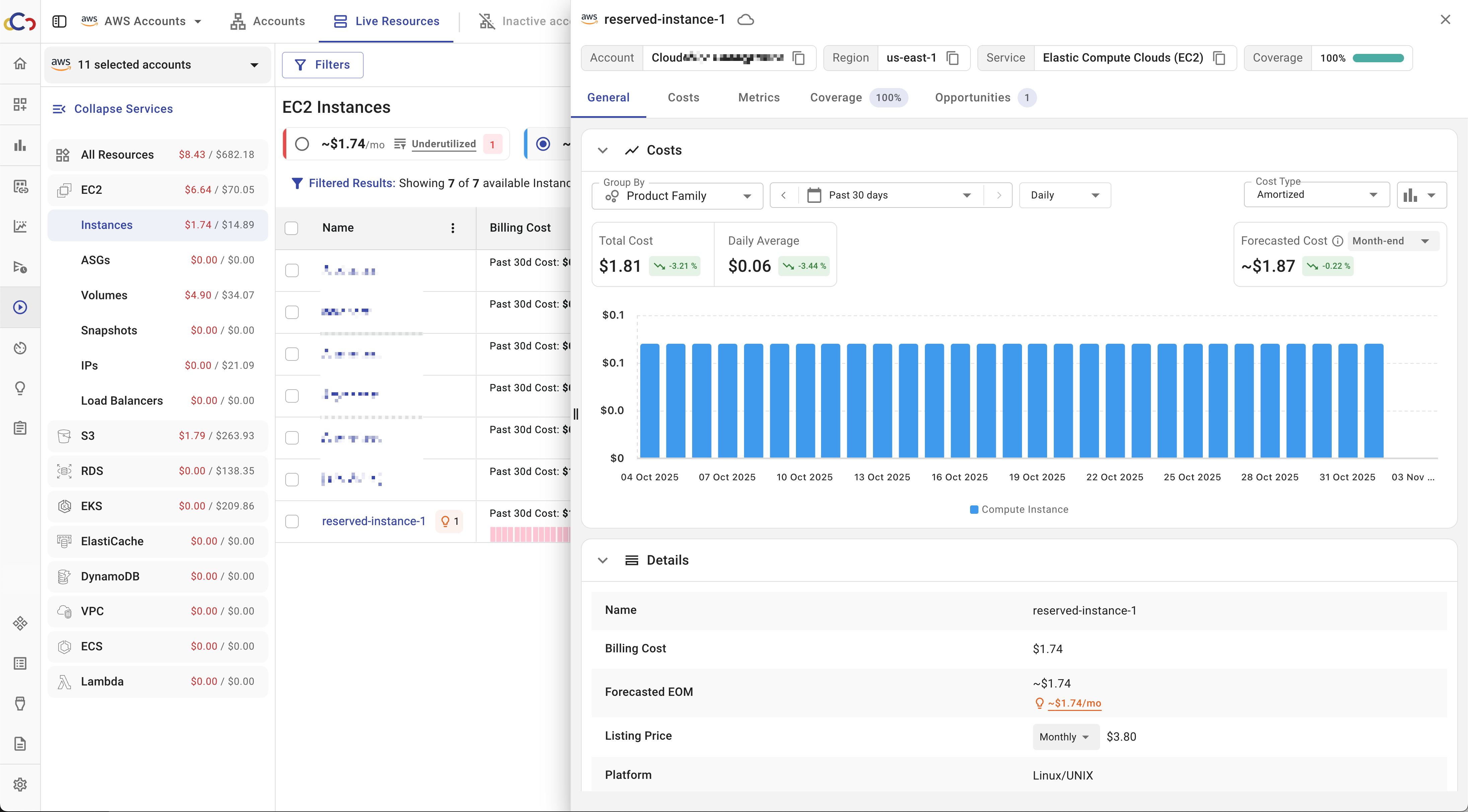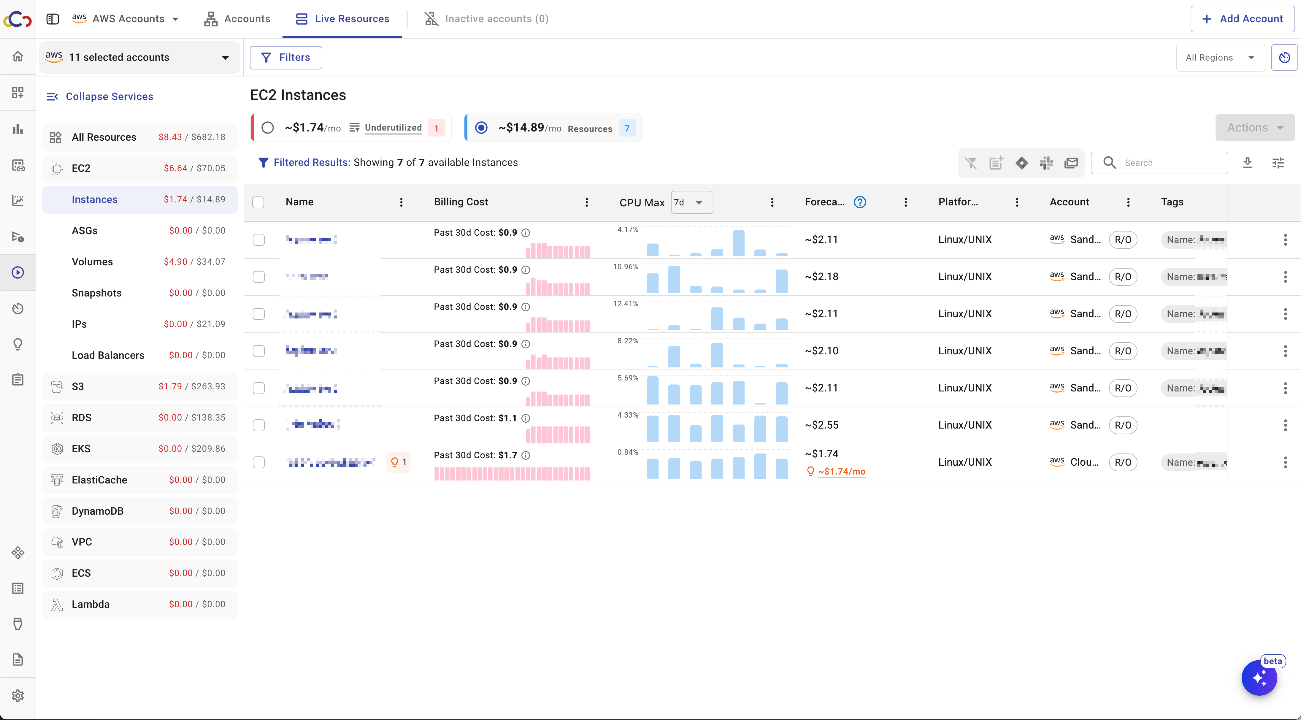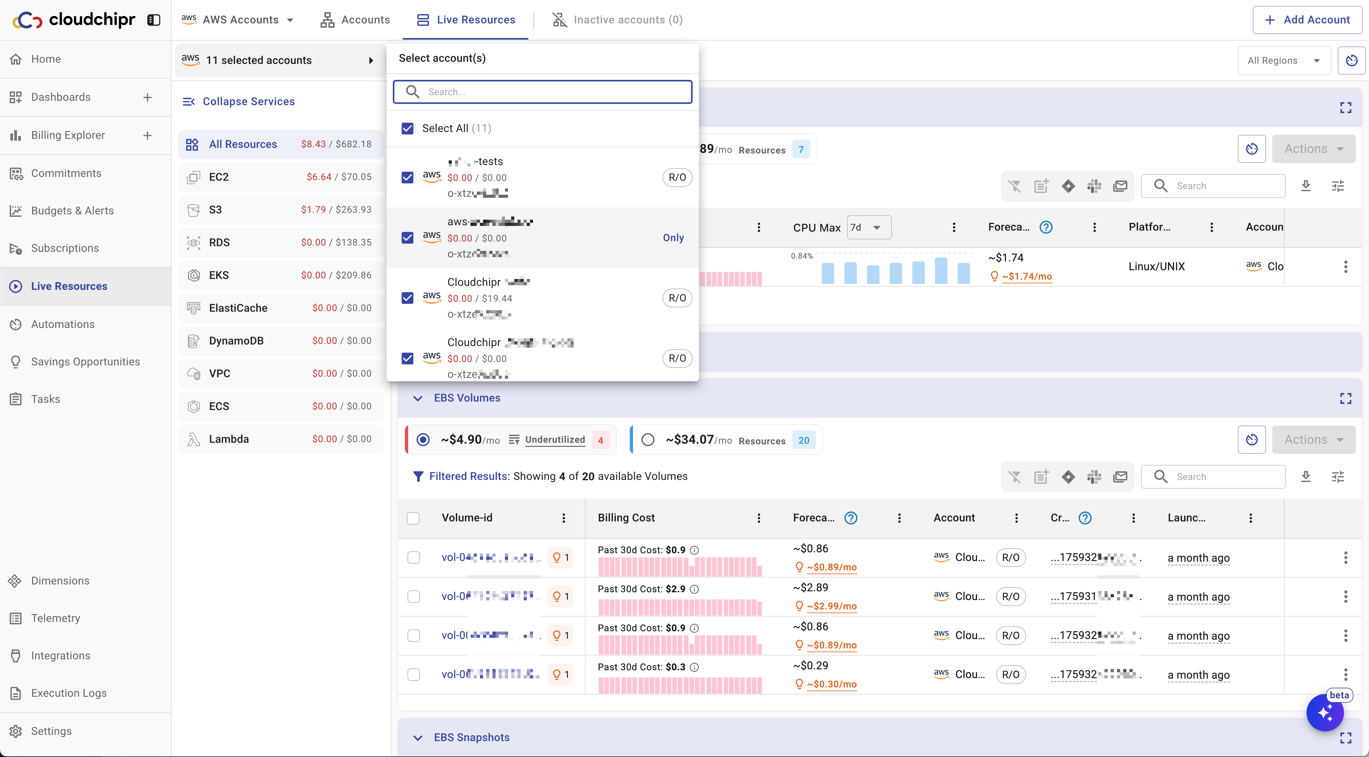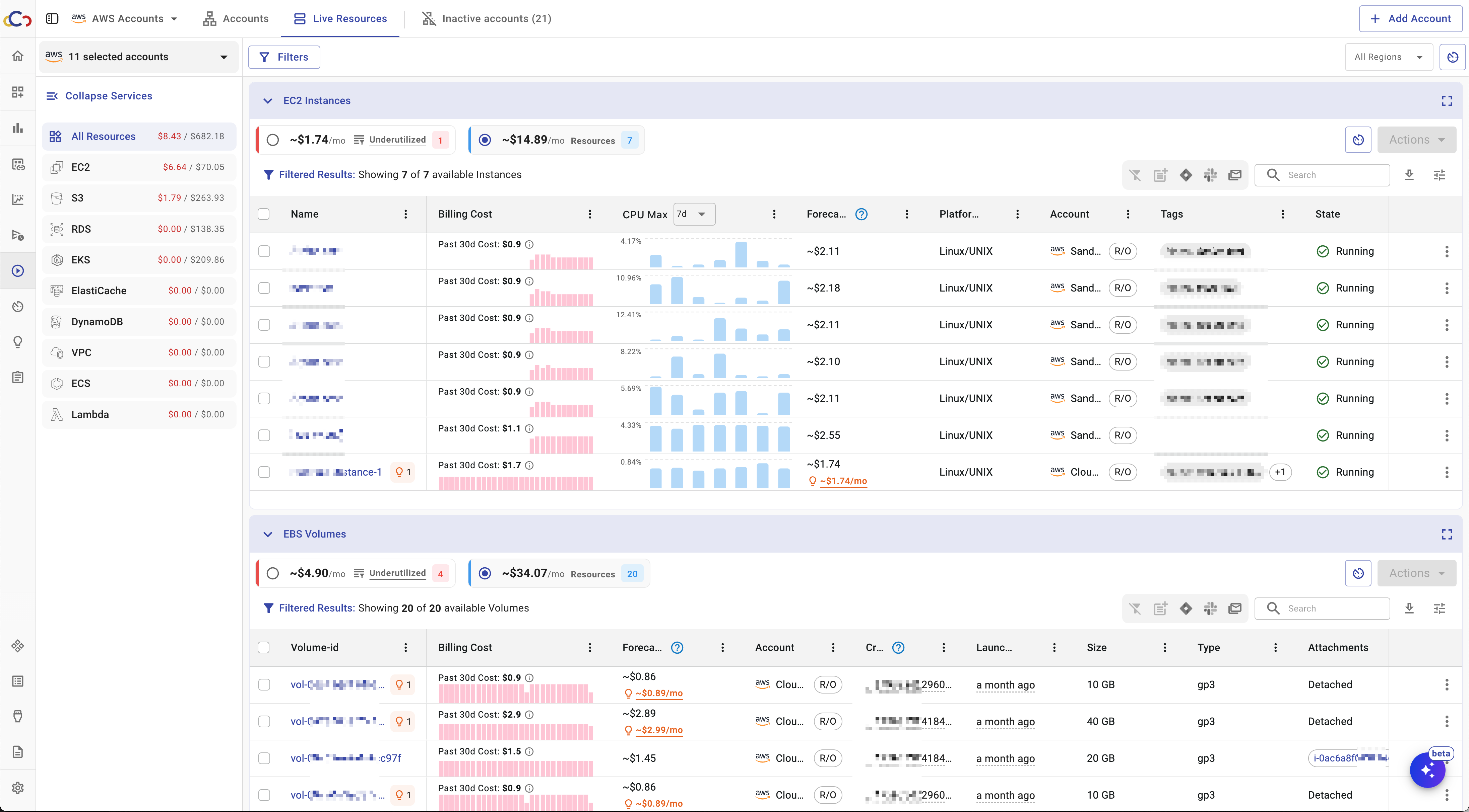 Selecting an account opens the Resources view. You can also select multiple accounts to view all live resources and costs across those accounts and regions on a single page.