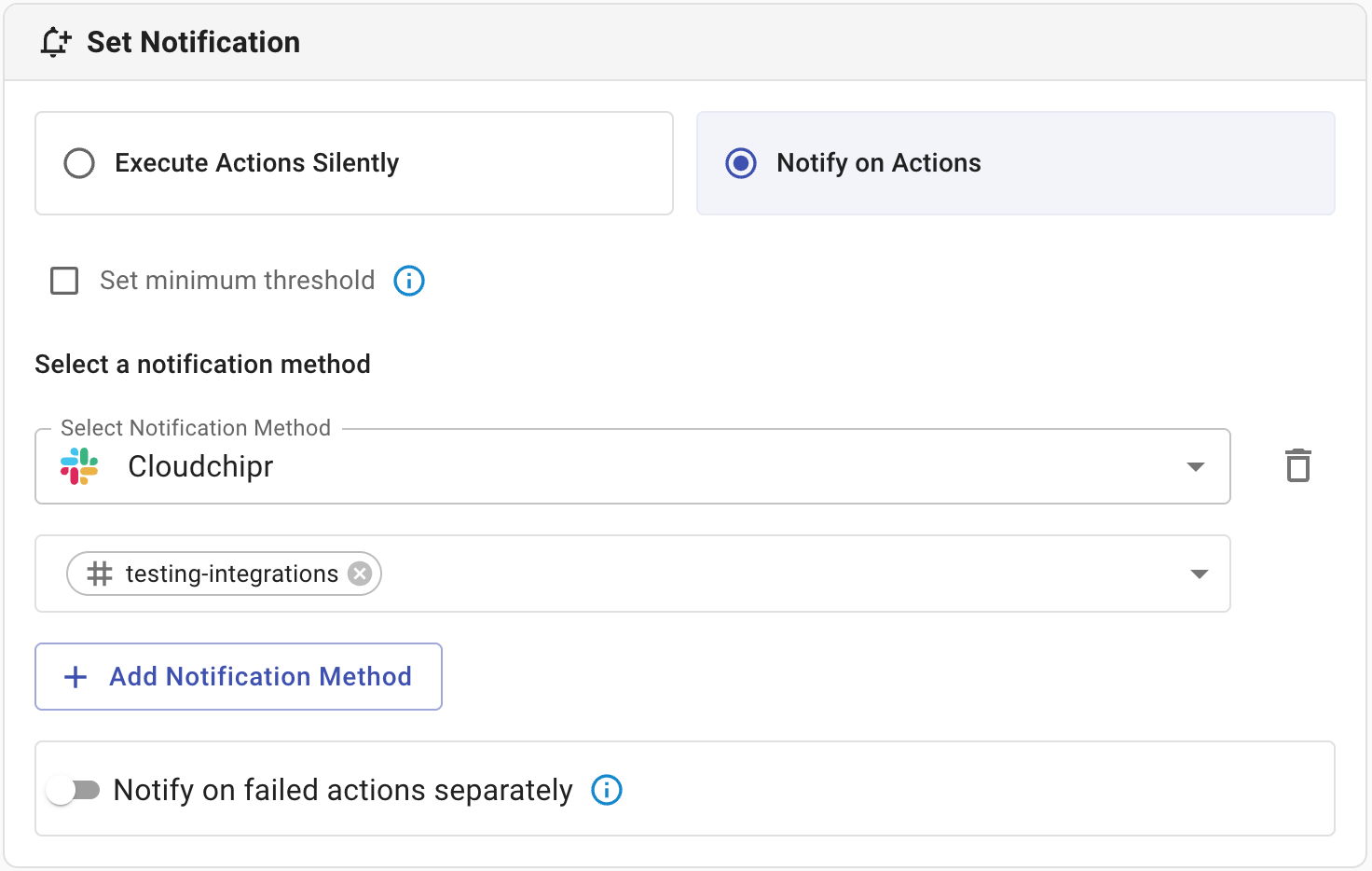 - Notify on Failed Actions Separately Turn this option on to receive dedicated notifications only for failed actions. This helps you stay informed about issues without receiving alerts for successful executions.