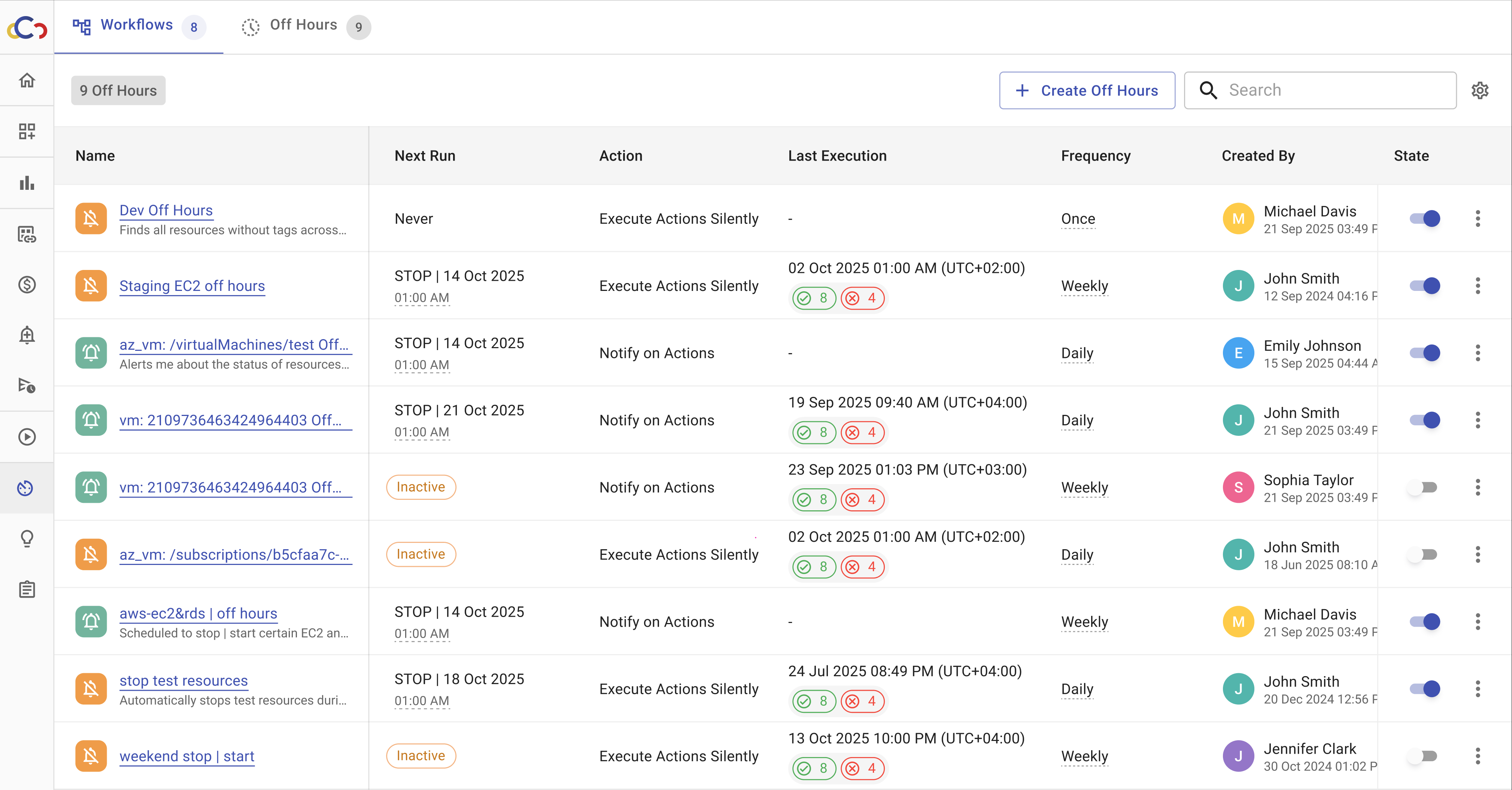 The Off-Hours page provides a centralized view of all automated Off-Hours schedules. From this page, you can easily track, manage, and control all schedules.