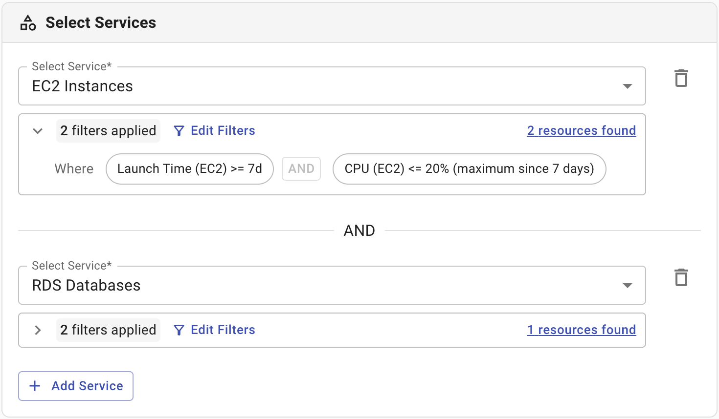 For example, you can filter EC2 instances that are Running and have CPU utilization ≤ 20% (maximum over the last 7 days).