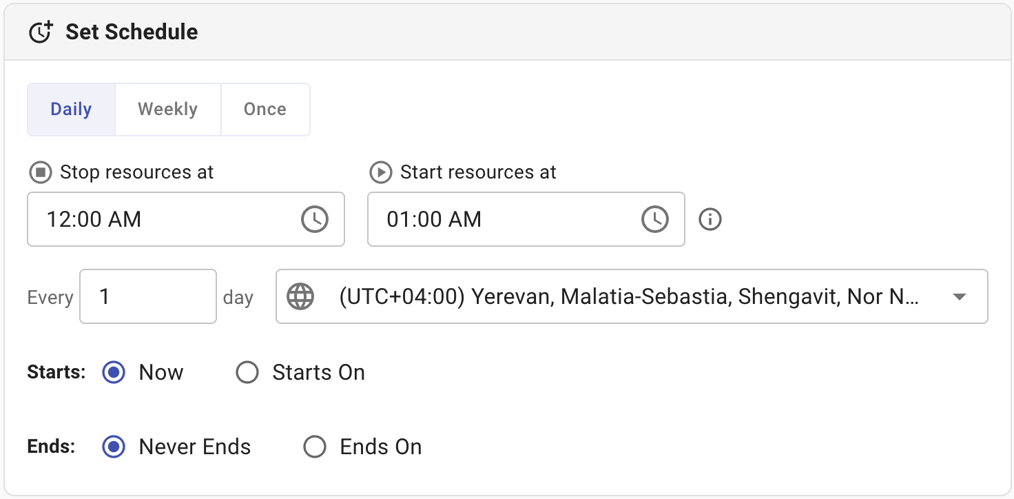 - Stop and Start Times: Define the times when Cloudchipr will stop selected resources and when the resources should automatically start again.